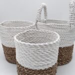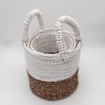 Seagrass Basket Set – Natural / White is perfect for displaying your products, multi-functional baskets are handwoven and add a genuine earthy look to any space.Sold in set of 3, each basket is handmade from eco-friendly seagrass. This easy to store trio is ideal for gift baskets, it can even be used as a chic flower pot. The largest one has an upper handle.Natural materials are seriously on trend, especially products made from nice looking seagrass are fashionable and easy selling.The colourful baskets can be used as tote bags, mini laundry baskets or to display your goodies you would like to have well-organized or easy and quick to grab. Dimensions of large basket: H: 17 cm (28 cm with a handle), D: 20 cmDimensions of middle basket: H: 16 cm, D: 17cmDimensions of small basket: H: 14 cm, D: 14 xm